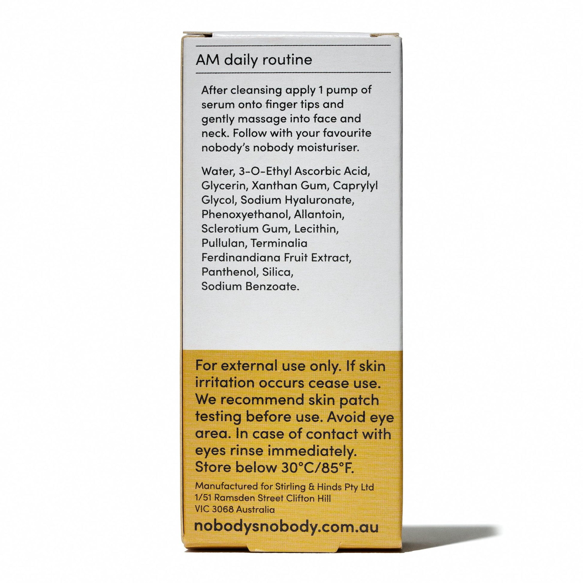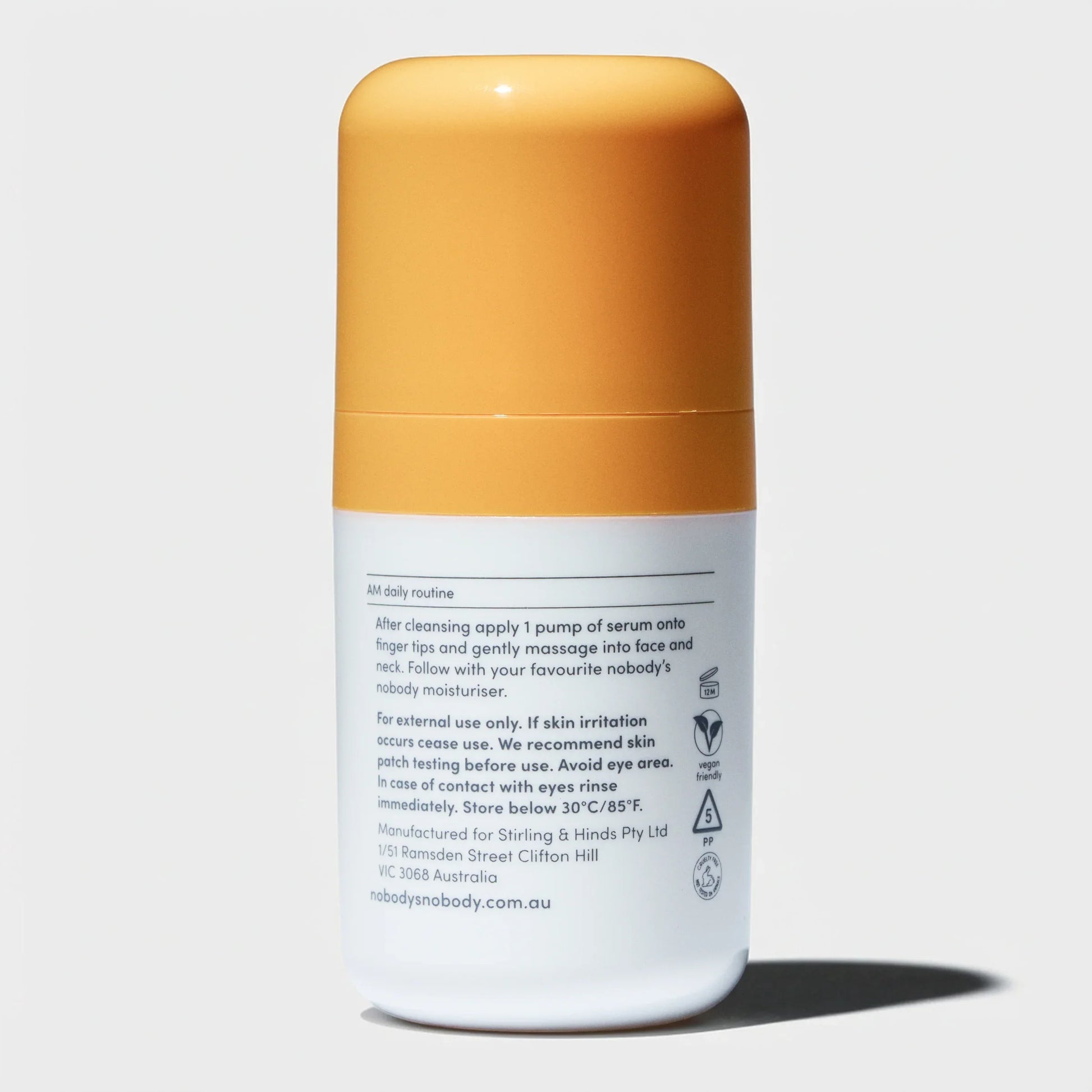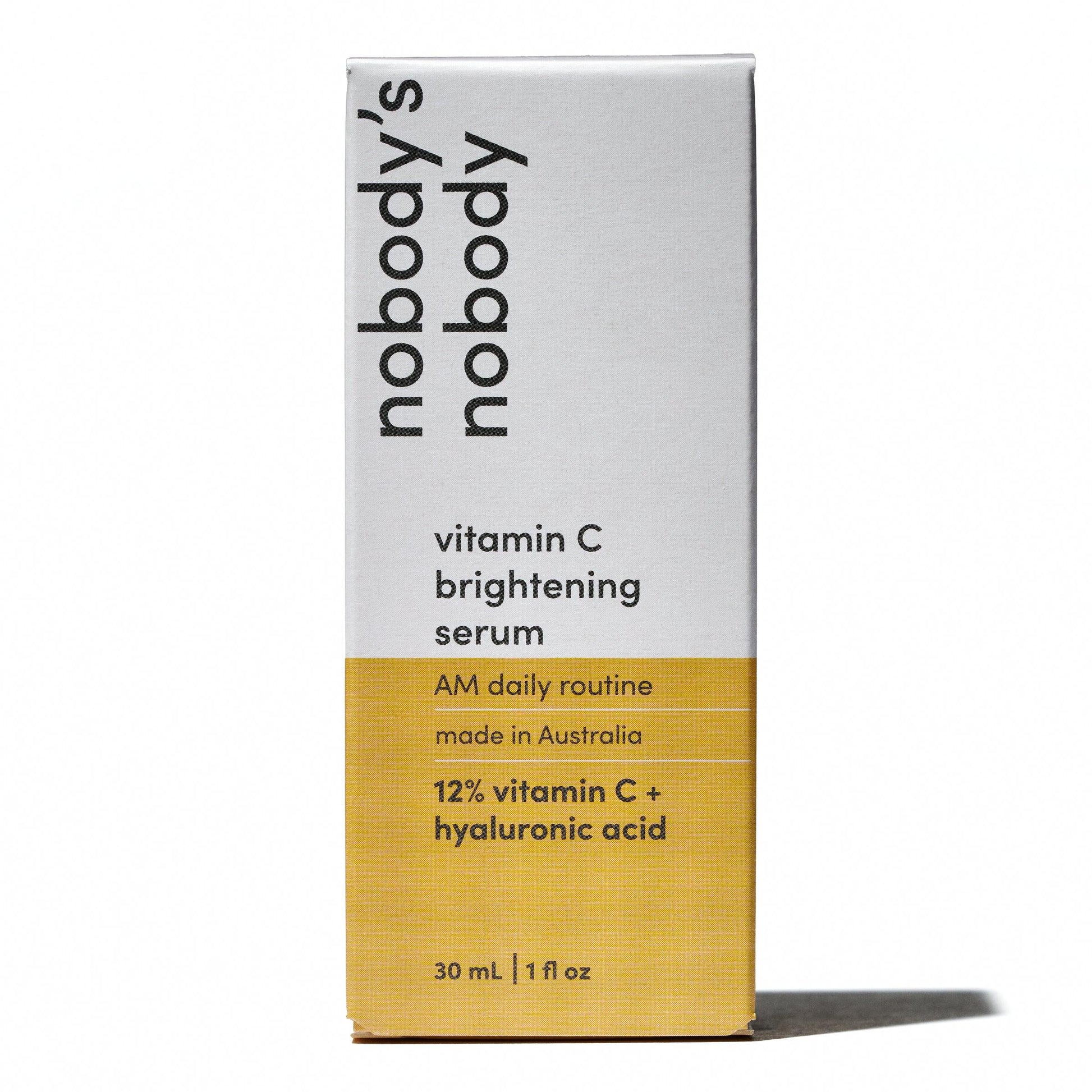 A concentrated 12% Vitamin C serum infused with hydrating Hyaluronic Acid. This lightweight formula helps brighten dull skin, even out skin tone, and reduce the appearance of fine lines. Use daily in the morning for optimal results—apply directly to the skin or mix with your favourite nobody’s moisturiser for an instant boost of radiance.