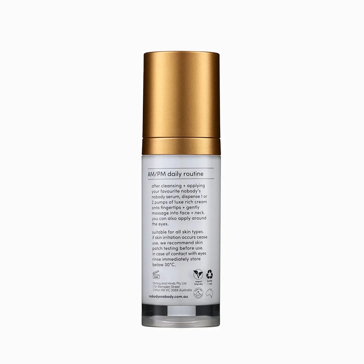 a highly effective and deeply nourishing cream to equal some of the best in the world. with a mix of fatty acids, hyaluronic acid + peptides to work synergistically for firmer, younger looking skin. leaving skin feeling luxuriously nourished + radiant.